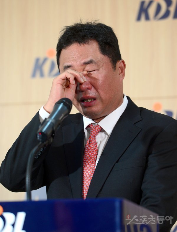 ‘무기한등록불허’를 받은 상태에서 ‘등록 불허를 철회’ 결정을 받은 전창진 기술고문이 인터뷰 중 눈물을 흘리고 있다.