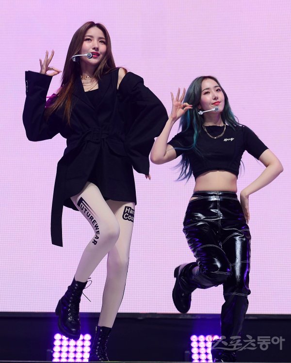 걸그룹 여자친구 소원과 신비(오른쪽)가 1일 서울 광진구 예스24 라이브홀에서 열린 일곱 번째 미니앨범 ‘피버 시즌(Fever Season)’ 발매 기념 기자간담회에서 열정적인 무대를 펼치고 있다.