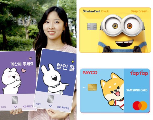 KB국민카드의 ‘오버액션 노리 체크카드’, 신한카드의 ‘미니언즈 딥드림 체크카드’, 페이코메이트 캐릭터를 디자인한 삼성카드의 ‘페이코 탭탭 카드’(왼쪽부터 시계 방향으로). 인기 캐릭터를 앞세운 카드 상품들이 각광받고 있다. 사진제공|KB국민카드·신한카드·삼성카드