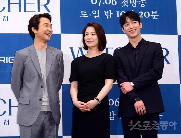 배우 한석규와 김현주, 서강준(왼쪽부터)이 2일 서울시 강남구 임피리얼 팰리스 서울에서 열린 OCN 새 토일 드라마 ‘왓쳐(WATCHER)’제작발표회에서 포토타임을 갖고 있다.
