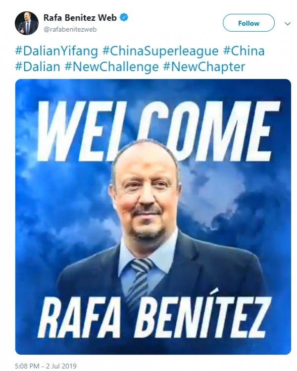 다롄은 2일(이하 한국시각) 베니테즈 감독 부임 기자회견을 개최했다. 베니테즈 감독도 자신의 SNS에 다롄 부임 소식을 게재했다.