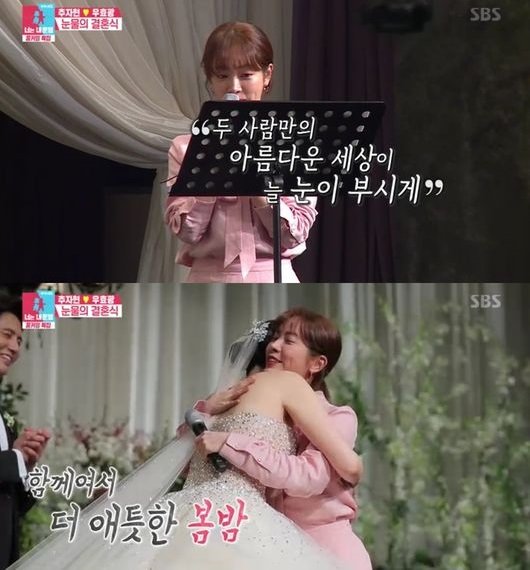 추자현과 우효광은 눈물과 웃음이 가득한 결혼식을 이어갔고, 소속사 절친한 후배인 한지민이 두 사람을 축복하기 위해 단상 위에 섰다.