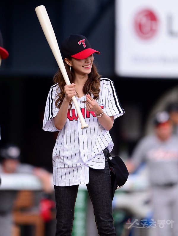 경기에 앞서 ’연예의 맛‘에 출연하는 이채은이 시타에 앞서 시구를 던지는 오창석을 향해 손가락 하트를 하고 있다.