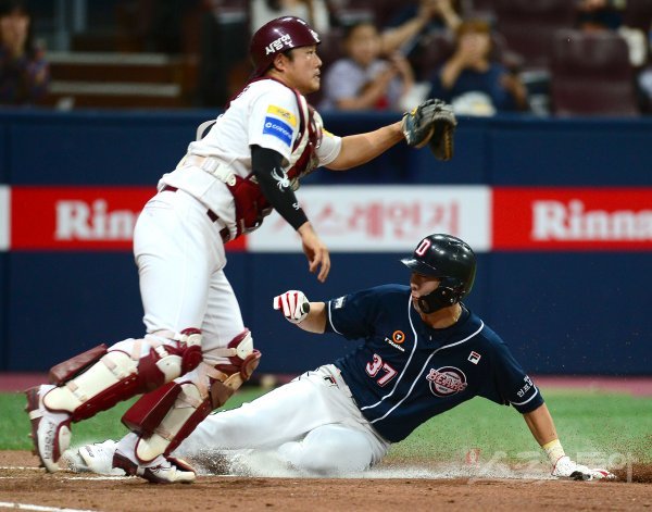 2일 서울 고척스카이돔에서 ‘2019 신한은행 MY CAR KBO리그’ 두산 베어스와 키움 히어로즈 경기가 열렸다. 4회초 1사 3루 두산 최주환 외야플라이 아웃 때 3루주자 박건우가 태그업 시도해 홈에서 세이프 되고 있다.