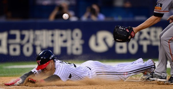 2일 서울 잠실야구장에서 ‘2019 신한은행 MY CAR KBO리그’ 한화 이글스와 LG 트윈스의 경기가 열렸다. LG 이천웅이 4회말 2사 3루에서 상대 폭투를 틈 타 홈으로 쇄도, 세이프 되고 있다.