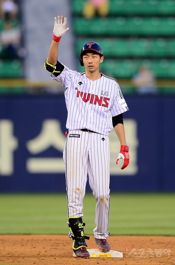 2일 서울 잠실야구장에서 ‘2019 신한은행 MY CAR KBO리그’ 한화 이글스와 LG 트윈스의 경기가 열렸다. LG 김용의가 4회말 1사 1,3루에서 적시 2루타를 친 후 1루 덕아웃을 향해 세리머니를 하고 있다.