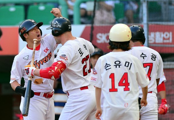 2일 인천 SK행복드림구장에서 ‘2019 신한은행 MY CAR KBO리그’ SK 와이번스와 롯데 자이언츠의 경기가 열렸다. 1회말 1사 1, 3루에서 SK 로맥이 좌월 3점 홈런을 쏘아 올린 뒤 최정의 환영을 받고 있다.