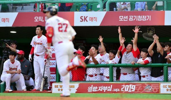 2일 인천 SK행복드림구장에서 ‘2019 신한은행 MY CAR KBO리그’ SK 와이번스와 롯데 자이언츠의 경기가 열렸다. 1회말 1사 1, 3루에서 SK 로맥이 3점 홈런을 쏘아 올리자 더그아웃의 동료들이 환호하고 있다.
