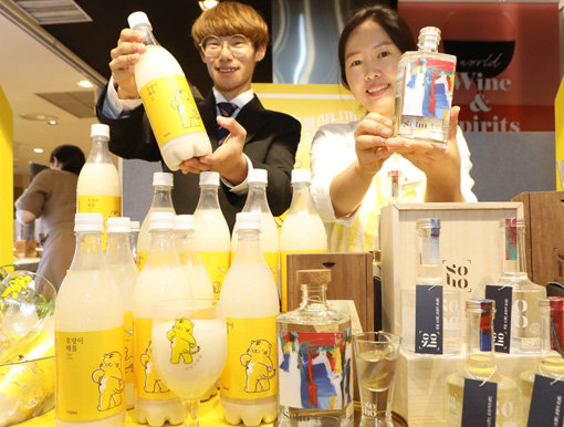 롯데백화점 직원들이 프리미엄 막걸리 ‘호랑이 배꼽’과 증류주 ‘소호’를 소개하고 있다. 롯데백화점은 3일까지 서울 소공동 본점 지하 1층 식품관에서 지역 전통 양조장을 지원하는 ‘찾아가는 양조장 특집전’을 진행한다. 찾아가는 양조장은 지역 우수 양조장을 선정해 전통주 생산부터 관광, 체험까지 연계한 복합공간으로 개발하는 사업이다.