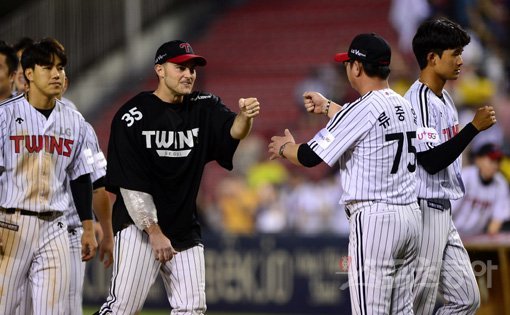 2일 서울 잠실야구장에서 열린 ‘2019 신한은행 MY CAR KBO리그’ 한화 이글스와 LG 트윈스의 경기에서 LG가 9-2로 승리했다. 경기 후 시즌 8승을 신고한 LG 윌슨이 류중일 감독(오른쪽)과 하이파이브를 하고 있다. 잠실|김진환 기자 kwangshin00@donga.com