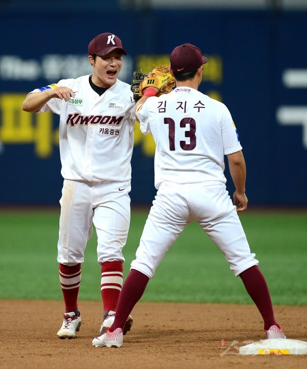 2일 서울 고척스카이돔에서 ‘2019 신한은행 MY CAR KBO리그’ 두산 베어스와 키움 히어로즈 경기가 열렸다. 6-3 역전승을 거둔 후 키움 김하성이 기뻐하고 있다.