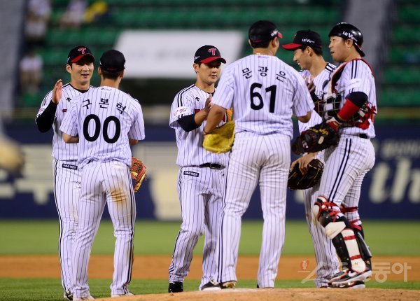 2일 서울 잠실야구장에서 열린 ‘2019 신한은행 MY CAR KBO리그’ 한화 이글스와 LG 트윈스의 경기에서 LG가 9-2로 승리했다. 경기 후 LG 선수들이 기쁨을 나누고 있다.