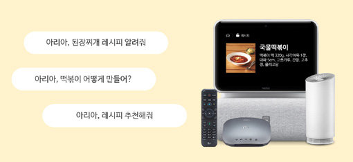 SK텔레콤은 인공지능(AI) 스피커 ‘누구’에 레시피 서비스 기능을 추가했다. 이용자가 “아리아, 레시피 추천해줘” 라고 말하면 해당 시간에 어울리는 요리 레시피를 추천하고, “아리아, 갈비찜 레시피 알려줘” 하면 요리에 필요한 재료부터 단계 별로 레시피를 안내한다. 특정 단계로 음성 명령을 하면, 명령한 단계에 맞는 레시피를 들을 수도 있다. 또 이용자의 재료 준비 시간 및 요리 시간을 고려해 대기 중에는 클래식 음악이 재생된다. 누구 레시피는 이밥차와의 제휴를 통해 총 2200여 개의 요리 레시피를 제공한다.