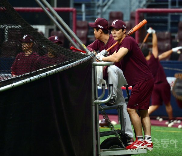 3일 서울 고척스카이돔에서 ‘2019 신한은행 MY CAR KBO리그’ 두산 베어스와 키움 히어로즈 경기가 열린다. 키움 김하성이 다른 선수들이 훈련 모습을 바라보고 있다.