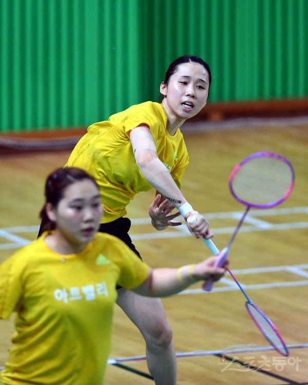 포천시청과 김천시청의 단체전 경기에서 포천시청 이정현-박수현(뒤)이 공격을 펼치고 있다.