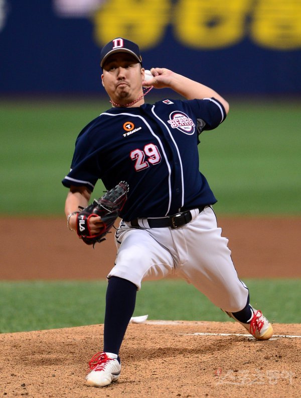 두산 유희관이 선발 등판해 힘차게 공을 던지고 있다.