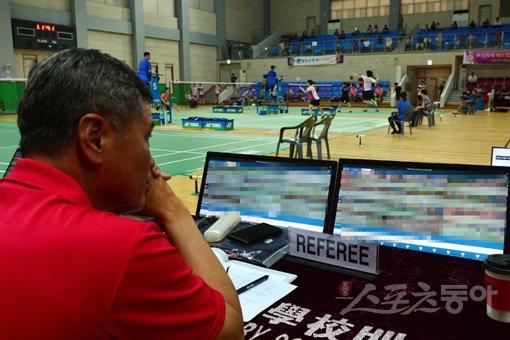 4일 화순에서 열린 ‘2019 이용대 올림픽제패기념 전국학교대항 배드민턴선수권’을 통해 국내 배드민턴 대회로는 처음으로 비디오 판독이 도입됐다. 심판이 영상을 지켜보고 있다. 사진은 제작업체의 요청으로 모자이크 처리함. 화순|김민성 기자 marineboy@donga.com