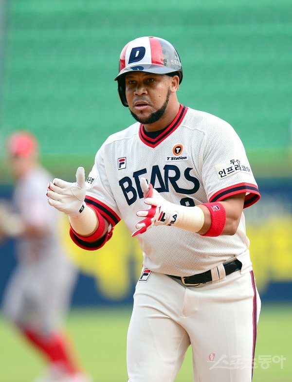 7일 서울 잠실야구장에서 ‘2019 신한은행 MY CAR KBO리그’ SK 와이번스와 두산 베어스 경기가 열렸다. 1회말 무사 1루 두산 페르난데스가 우전 안타를 치고 1루에서 기뻐하고 있이.