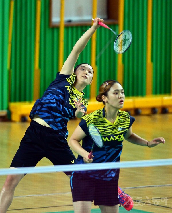 공주대학교(이하나-길수민)와 동양대학교(이현정-원가현)의 여자 대학부 복식 16강 경기에서 공주대 이하나(뒤)가 공격을 펼치고 있다.
