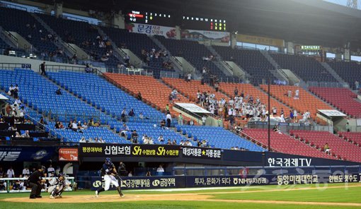 혹서기인 7·8월, 프로야구의 주말 경기 개시 시간이 야구 팬들의 편의를 반영하지 못한 오후 6시로 일괄 변경돼 진행되는 까닭에 현장에서는 관중 감소로 애를 먹고 있다. 사진은 스탠드가 텅 빈 채 경기가 진행되고 있는 잠실구장. 스포츠동아DB