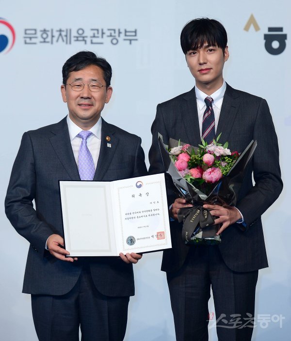 배우 이민호가 9일 서울 중구 더 플라자 호텔에서 열린 ‘2019 세계한국어교육자대회’ 개회식과 세종학당 홍보대사 위촉식에 참석해 박양우 문화체육관광부 장관(왼쪽)과 포즈를 취하고 있다.