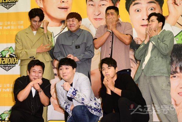 9일 서울 마포구 상암동 스탠포드 호텔 서울에서 열린 XtvN ‘플레이어’ 제작발표회에 출연진들이 참석해 포즈를 취하고 있다. 왼쪽 위부터 시계방향으로 모델 정혁, 개그맨 이진호, 격투기 선수 김동현, 개그맨 이용진, 배우 이이경, 개그맨 황제성, 이수근.