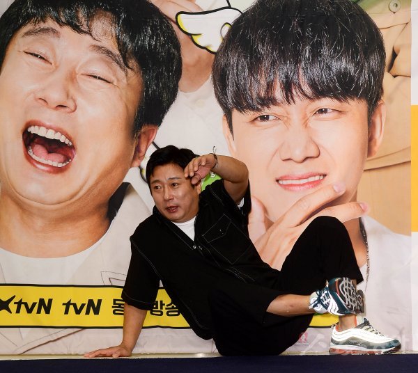 개그맨 이수근이 9일 서울 마포구 상암동 스탠포드 호텔 서울에서 열린 XtvN ‘플레이어’ 제작발표회에 참석해 포즈를 취하는 중 넘어지고 있다.
