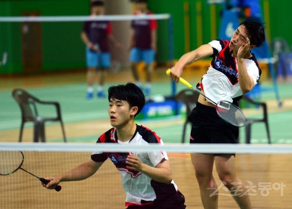 원광대학교(서승재-임수민)와 백석대학교(안진하-박문선)의 남자 대학부 복식 16강 경기에서 백석대 안진하(오른쪽)가 공격을 펼치고 있다.