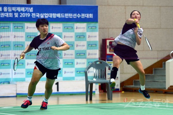 공주대학교(이하나-길수민)와 군산대학교(김민지-박지윤)의 여자 대학부 복식 8강 경기에서 군산대 김민지(오른쪽)가 공격을 펼치고 있다.