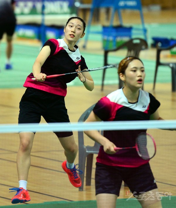 공주대학교(이하나-길수민)와 군산대학교(김민지-박지윤)의 여자 대학부 복식 8강 경기에서 공주대 이하나(왼쪽)가 공격을 펼치고 있다.