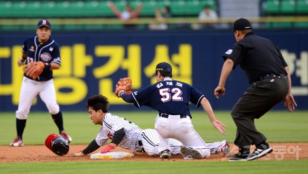 9일 서울 잠실야구장에서 ‘2019 신한은행 MY CAR KBO리그’ 두산 베어스와 LG트윈스 경기가 열렸다. 1회말 무사 1루 상황에서 1루주자 LG 이천웅이 2루 도루에 성공하고 있다.
