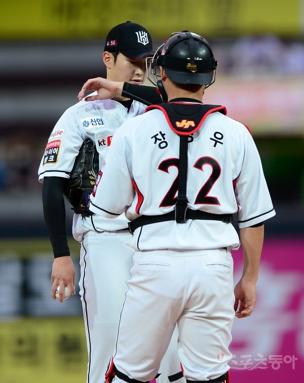 9일 경기도 수원 kt위즈파크에서 ‘2019 신한은행 MY CAR KBO리그’ 키움 히어로즈와 kt 위즈의 경기가 열렸다. kt 배제성이 1회초 볼넷과 안타 등으로 3실점을 한 후 마운드에 올라온 장성우 포수와 대화를 나누고 있다.