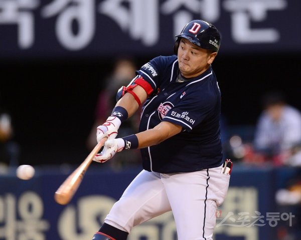 9일 서울 잠실야구장에서 ‘2019 신한은행 MY CAR KBO리그’ 두산 베어스와 LG트윈스 경기가 열렸다. 5회초 1사 만루 두산 최주환이 역전 희생타를 치고 있다.