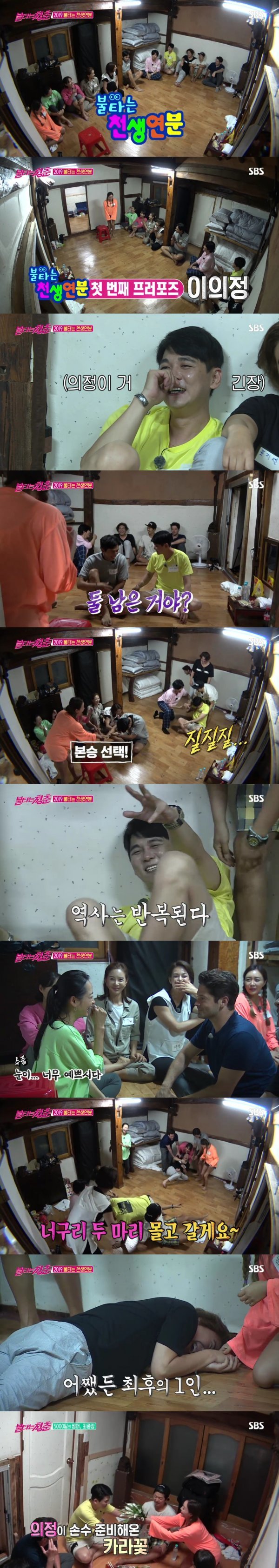 이날, 인삼을 넣은 삼계탕으로 보양식을 먹은 청춘들은 17년 전 최민용이 이의정에게 퇴짜를 맞은 ‘천생연분’을 떠올리며 2019년 불타는 ‘천생연분’을 재현했다. 첫 번째 프러포즈 대상자로 의정이 나오자 민용은 “아! 옛날 생각난다”며 긴장했다. 의정은 귀여운 하트와 사랑의 총알탄 ‘애교’로 어필했다. 이어 의정이 남자들에게도 매력 어필을 요구하자 모두 들어가고 구본승과 최민용, 둘만 남아 과거와 똑 같은 상황이 펼쳐졌다. 드디어 선택의 시간이 오자 의정은 본승을 선택하고, 최민용은 질질 끌려가 재차 퇴짜의 좌절을 맞았다.