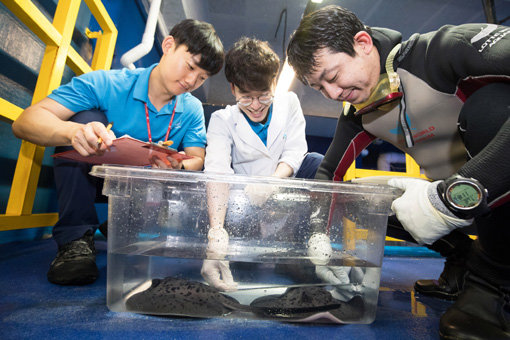 서울 잠실 롯데월드 아쿠아리움(대표 박동기)는 8일 멸종 위기 해양생물인 부채가오리의 아쿠아리움 내 자연번식을 국내 최초로 성공했다. 이날 태어난 부채가오리는 6마리다.