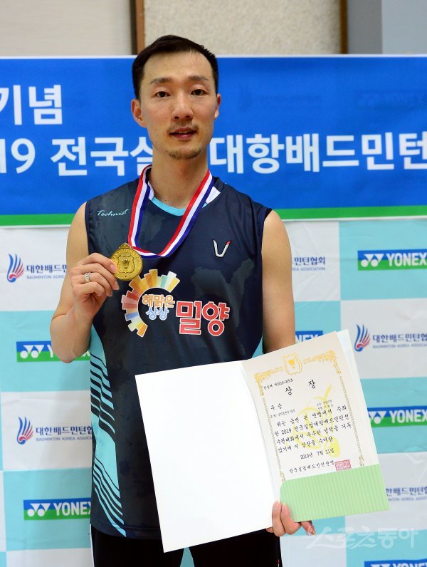11일 전라남도 화순에서 제 10회 이용대올림픽제패기념 ‘2019 전국학교 및 실업대항 배드민턴 선수권대회’가 열렸다. 밀양시청 이현일과 성남시청 박완호의 남자 일반부 단식 결승 경기에서 이현일이 우승을 차지한 뒤 기념촬영을 하고 있다.