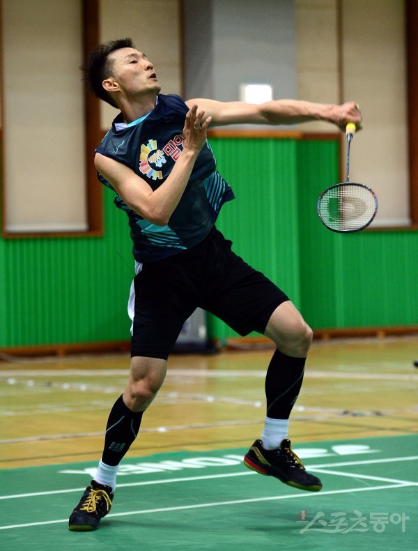 11일 전라남도 화순에서 제 10회 이용대올림픽제패기념 ‘2019 전국학교 및 실업대항 배드민턴 선수권대회’가 열렸다. 밀양시청 이현일과 성남시청 박완호의 남자 일반부 단식 결승 경기에서 이현일이 공격을 펼치고 있다.