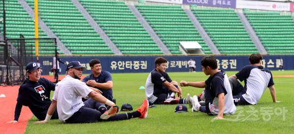 두산 선수들이 경기 전 밝은 표정을 지으며 스트레칭을 하고 있다.