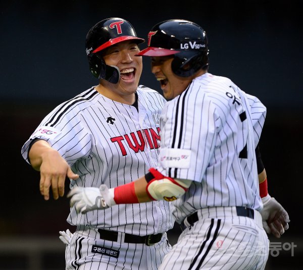 11일 서울 잠실야구장에서 ‘2019 신한은행 MY CAR KBO리그’ 두산 베어스와 LG 트윈스의 경기가 열렸다. LG 유강남이 2회말 무사 2루에서 시즌 1호 투런 홈런을 친 후 김현수(왼쪽)과 기쁨을 나누고 있다.