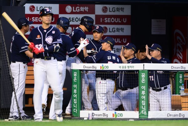 11일 서울 잠실야구장에서 ‘2019 신한은행 MY CAR KBO리그’ 두산 베어스와 LG 트윈스의 경기가 열렸다. 두산 덕아웃 코칭스테프들이 3회초 역전에 성공한 후 득점 후 들어오는 선수들을 반기고 있다.