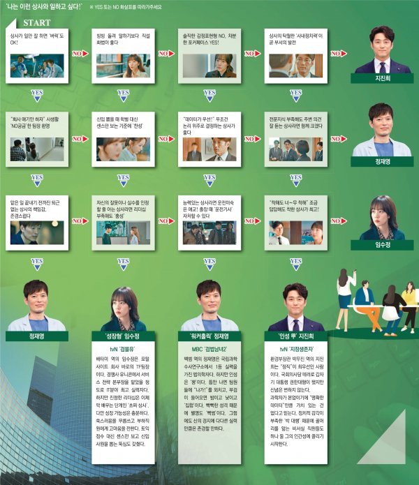 포털사이트, 국립과학수사연구소, 청와대까지! 최근 드라마 속 기업 혹은 조직 내 리더의 모습에 시청자가 주목하고 있다. MBC ‘검법남녀2’, tvN ‘검색어를 입력하세요 WWW’(검블유), tvN ‘60일, 지정생존자’(지정생존자) 속 주인공 캐릭터가 그 주인공이다. 실력은 완벽하지만 인성은 ‘꼴찌’인 정재영, 경험이 부족해도 의지만은 충만한 임수정, 정치에 대한 관심은 없지만 인간성은 ‘최고’인 지진희까지 각양각색의 리더들이 눈길을 모은다. 당신이 생각하는 가장 이상적인 리더의 모습은 어떤 것인가. ‘나의 상사 이상형’이 여기 있다.