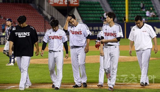 11일 서울 잠실야구장에서 열린 ‘2019 신한은행 MY CAR KBO리그’ 두산 베어스와 LG 트윈스의 경기에서 두산이 8-4로 승리하며 3연승을 질주했다. 경기 후 LG 선수들이 고개를 떨군 채 덕아웃으로 향하고 있다. 잠실|김진환 기자 kwangshin00@donga.com