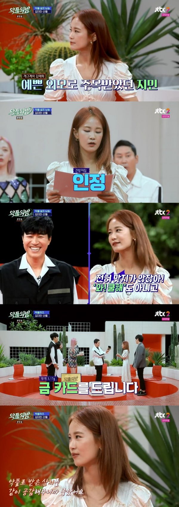 아울러 김지민은 남다른 승부욕까지 발휘했다. 이어진 락(樂)플퀴즈 코너에서는 게스트에게 달린 락플(즐거운 댓글) 중 일부를 맞히면 주사위를 굴려 해당하는 상품을 증정하는 혜택이 주어졌다. 이때 산들에게 달린 락플 중 빈칸에 들어갈 단어로 ‘원룸’이 등장했고, 산들이 ‘월룸’이라고 발음하는 사이 김지민은 '원룸'이라고 또박또박 발음해 정답을 가로채며 큰 웃음을 선사했다.