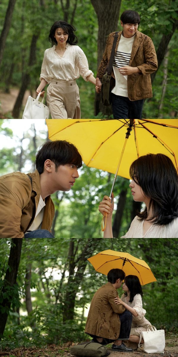 첫 번째 사진 속 손지은과 윤정우는 손을 잡은 채 함께 비를 피해 숲 속을 뛰고 있다. 비를 맞을지도 모르는 상황임에도 두 사람 얼굴에 비친 미소가 이들이 느끼고 있는 사랑의 감정을 보여준다. 또 다른 사진에서는 함께 노란 우산을 쓴 채 서로를 애틋하고 깊은 눈빛으로 바라보고 있다. 비를 피하기 위해서라도 가깝게 다가선 두 사람의 거리가 보는 사람까지 가슴 떨리게 한다.