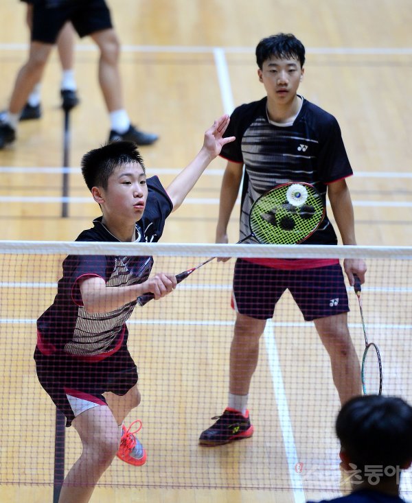 13일 전라남도 화순 하니움문화스포츠센타와 이용대체육관에서 열린 제10회 ‘이용대 올림픽제패기념 2019 화순 전국학교대항 및 실업대항 배드민턴선수권대회’ 남자중학교 단체전 16강 1복식에서 옥련중 장준희(위)-조문희 조가 리턴을 하고 있다.