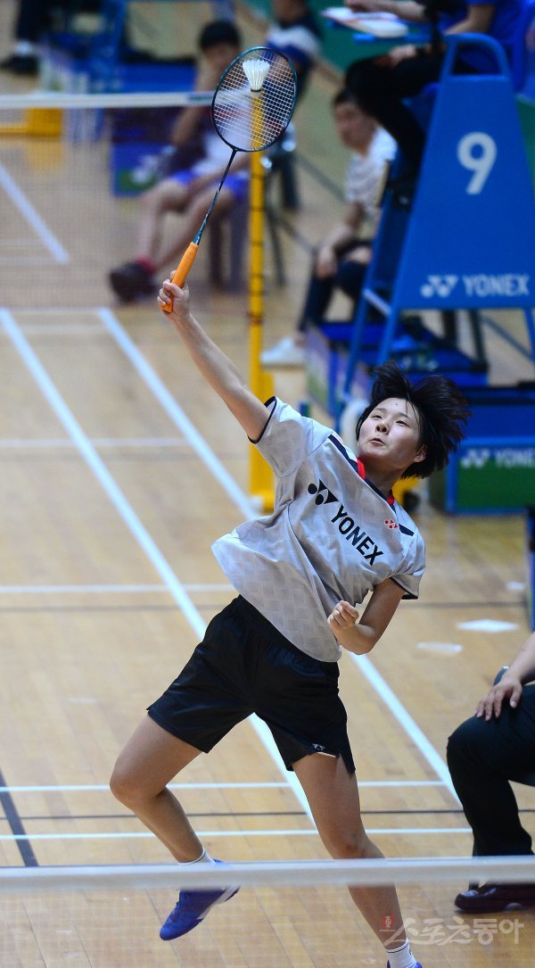 13일 전라남도 화순 하니움문화스포츠센타와 이용대체육관에서 열린 제10회 ‘이용대 올림픽제패기념 2019 화순 전국학교대항 및 실업대항 배드민턴선수권대회’ 여자고등학교 단체전 16강 1단식에서 광주체육고 유아연이 스매싱 공격을 하고 있다.