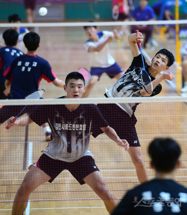 13일 전라남도 화순 하니움문화스포츠센타와 이용대체육관에서 열린 제10회 ‘이용대 올림픽제패기념 2019 화순 전국학교대항 및 실업대항 배드민턴선수권대회’ 남자고등학교 단체전 16강 1복식에서 김천생명과학고 김덕영-이원준(오른쪽) 조가 스매싱 공격을 하고 있다.