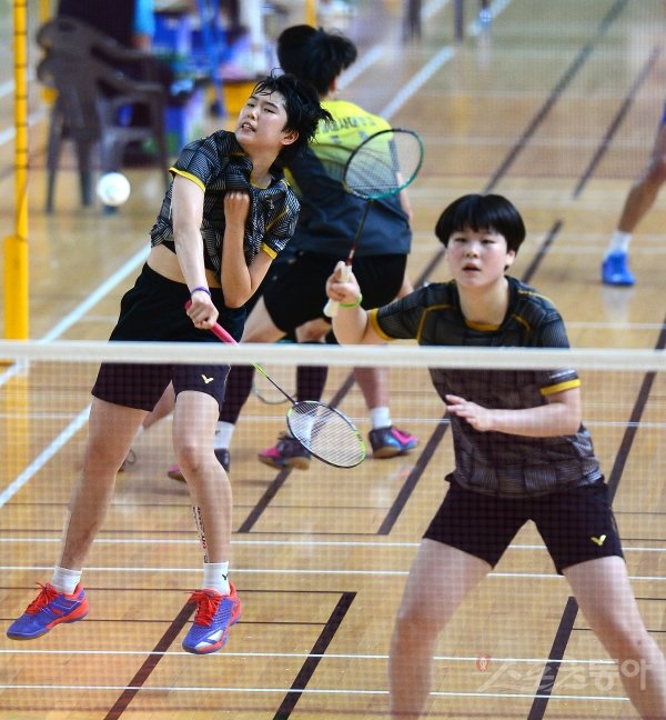 14일 전라남도 화순 하니움문화스포츠센타와 이용대체육관에서 열린 제10회 ‘이용대 올림픽제패기념 2019 화순 전국학교대항 및 실업대항 배드민턴선수권대회’ 여자고등학교 단체전 준결승 1복식에서 성일여고 정다정(왼쪽)-최혜진이 스매싱 공격을 하고 있다.