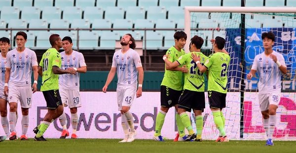14일 전주월드컵경기장에서 ‘하나원큐 K리그1 2019’ 전북 현대와 울산 현대의 경기가 열렸다. 전반 전북 이동국(가운데)이 패널티킥을 성공시킨 후 동료들과 기쁨을 나누고 있다.