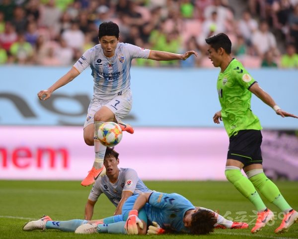 14일 전주월드컵경기장에서 ‘하나원큐 K리그1 2019’ 전북 현대와 울산 현대의 경기가 열렸다. 전반 울산 김민성이 전북 골키퍼 송범근이 쓰러진 사이 골대를 향하고 있다.